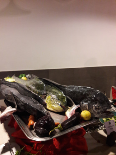 Повара специально кладут на прилавок огромных рыб, которых они готовят, и придерживают, чтобы удобнее было фотографировать. Из названий запомнила только тунца и марлина — потому что слышала о них раньше, видела на рынке в испанском Кадисе. Марлина чуть не упустила: оставила смартфон в номере, а возвращаться смысла не было — буквально за считанные минуты он стал похож на своего собрата, воспетого Хэмингуэем в «Старик и море». Так что взяла за правило приходить в ресторан во всеоружии. И в последний вечер была вознаграждена, снова давали марлина. На нос ему натыкали помидор, чтобы гости не напарывались. На снимке не очень видно, какой он огромный: хвост свешивается за прилавок. Вообще снимки, если честно, получились не очень: народу много толкается, кто-то снимает, кто-то только ждет свой кусочек, вечером еще и темно. Некоторые совсем мутные я удалила, остальные оставила — уж какие есть. Жалко, что «желудок у котенка чуть больше наперстка»: большого труда стоило удерживаться от того, чтобы все перепробовать. Если отказ от выпечки-пирожных давался легко, то взять только пару ломтиков карпаччо из тунца с маракуйей гораздо труднее. Первый раз я маракуйю попробовала на фруктовом рынке Фуншала, там ее множество сортов предлагают. Предприимчивые продавцы в ту, что дают попробовать, ковырнув ложечкой и капнув тебе на ладонь, предварительно добавляют сахар. Поэтому не так заметно, насколько она кислая. Здесь только один сорт, нестерпимо кислый, но я как-то втянулась. И после нее арбуз не такой безвкусный. Не знаю, не сезон у них на арбузы или поставщик неудачный, но сладкие попадались только пару раз. Манго крупные зеленые, иногда очень спелые, иногда не очень. Вот ананасы им всегда удавались, хотя, на мой вкус, сильно сладкие. Папайя была редко, а еще как-то раз заметила половину крупного шипастого плода. Спросила у девочек, что это такое, и попросила попробовать. Они назвали, но слово незнакомое. Потом в интернете нашла картинку: похоже, это была гуанабана. Девочки отрезали от плода кусочек и наковыряли для меня съедобную часть. Не скажу, что это было «райское наслаждение», но у них и арбузы не очень вкусные. Во всяком случае, попробовала. А больше ни разу не видела. Надо сказать, вежливость творит чудеса (ну и минимальное знание английского): когда я как-то попросила отрезать папайю, девочка сбегала в закрома и принесла фрукт поспелее, хотя до этого резала вполне съедобный. Бананчики у них выкладывались гроздьями, гости сами отрывали нужное количество. Кокосов не было ни разу, его я попробовала в поездке на кораблике. Может, в холодном виде это вкуснее, но теплая сладкая жидкость на меня впечатление не произвела, как и «мякоть кокоса».