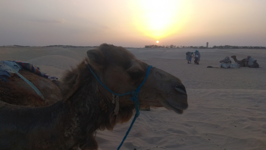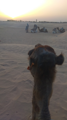 Дозу адреналина получили,дочь была в восторге.Никто не потерялся,все ехали гуськом за проводником.Затем нас пересадили на верблюдов.Достаточно большое животное,когда оно поднимается и садится,надо крепко держаться,т.к.верблюд сильно наклоняется,проводники уже привыкли,что девочки начинают визжать.В Сахаре мы должны были встретить закат солнца.Мерно покачиваясь на верблюде. К слову сказать,верблюд покачивался довольно таки ощутимо,прямо болтался.Здесь следовало расслабиться,забыть ,что ты на высоте пары метров и ничем не закреплен,и довериться своему животному.Покачиваясь вместе с ним,попутно успевая фотографировать и снимать.Погонщик отдает мне поводья и рассказывает ,как управлять животным,который понимает только команды на арабском, и дочь пугается.Она думает,что сейчас верблюд ускачет галопом в закат.Но я то знаю,что верблюд не меньше хочет домой ,что он привык ходить с караваном и найдет дорогу с закрытыми глазами.
