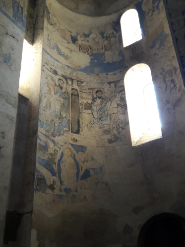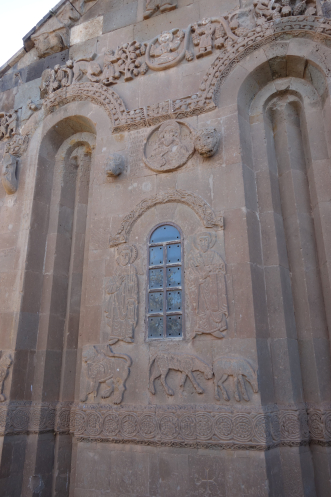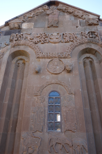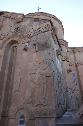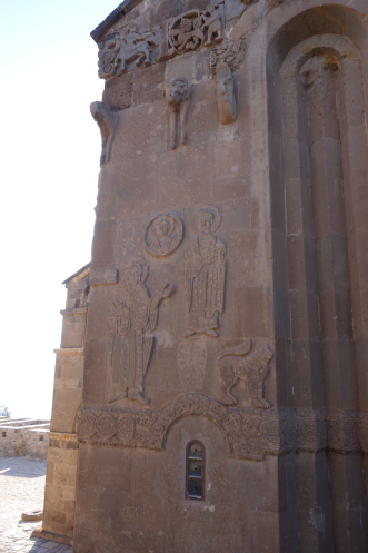 Церковь построили в начале X века и активно пользовались ей до 1915 года, когда в результате геноцида армян монахов разогнали. Турция не признает геноцид, поэтому гиды озвучивают официальную версию: это была гражданская война, спровоцированная обещаниями западных империалистов поддержать исторически живших в этих местах армян в борьбе за независимое государство. Судить не берусь, хотя что-то мне подсказывает, что среди проигравших армян пострадавших было гораздо больше, чем среди победивших турок. Еще в советское время я была в Армении и там нам рассказывали, что армянская церковь не признает украшение храмов, хотя эчмиадзинский кафедральный собор очень даже раззолочен: там престол каталикоса всех армян. А эта церковь Св. Креста на острове украшена резьбой по камню снаружи и фресками изнутри, но по форме напоминает церкви Армении (что неудивительно, здесь не одну сотню лет жили армяне). Из-за удаленности острова церковь не сильно пострадала от вандализма, а в 2007 году ее отреставрировали как музей, хотя раз в год здесь проводится служба. Религиозными и светскими рельефами покрыта почти вся внешняя поверхность церкви: здесь и сюжеты Ветхого и Нового заветов, и «звериный гон», и «сбор винограда»: зодчий Мануэл был не только архитектором, но и скульптором.