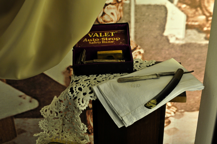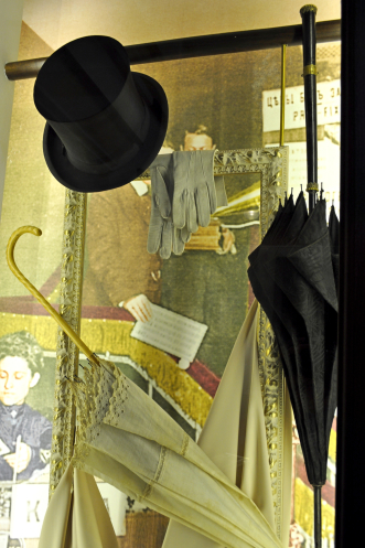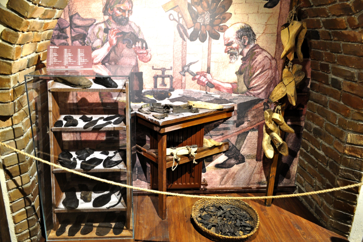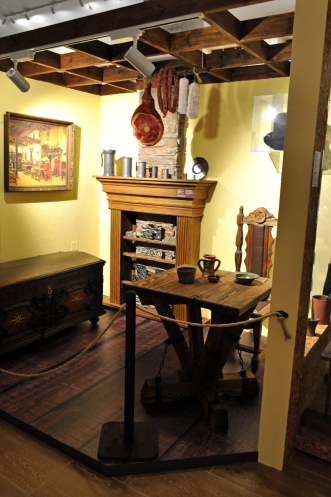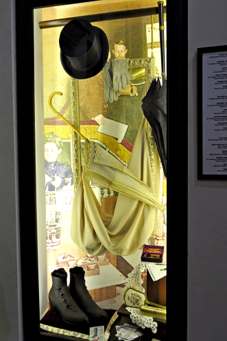 Кроме того, представлены витрины популярных магазинов рубежа XIX-XX веков – магазин Левина, аптека Староневича, с экспонатами, конечно. Среди них внимание может привлечь абсолютно вся аптека с тенктурами и прочими флаконами и флакончиками, весами и… всем тем, чем, например, можно пустить кровь страждущему. И такие предметы женского туалета как ботинки верхние… безразмерного 43 размера, обуваемые поверх туфель дамских, например. По принципу калош. А также цилиндр «Шапокляк», работающий! Но демонстрировать мне отказались, потому что процесс вскрытия витрин затруднительный. Но цилиндр функционирующий, работники проверяли: легким ударом он складывается в таблетку и пригоден для помещения подмышку при вскакивании в вагон конки…