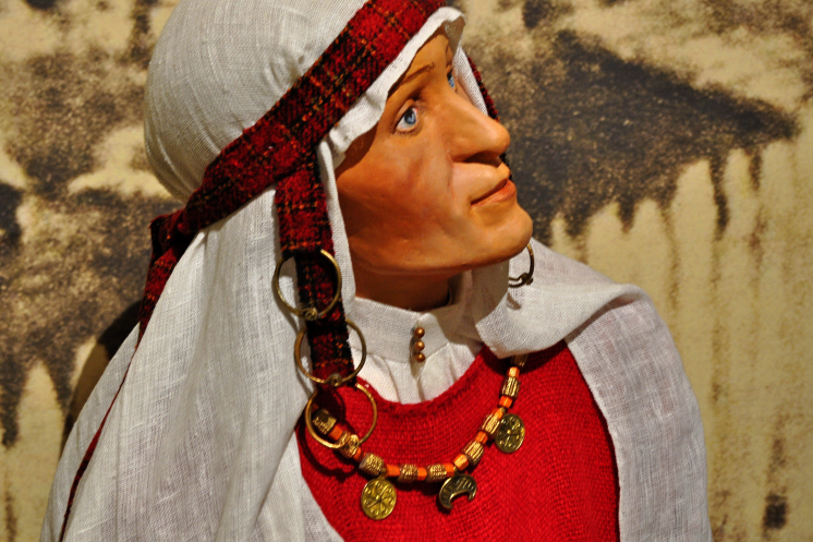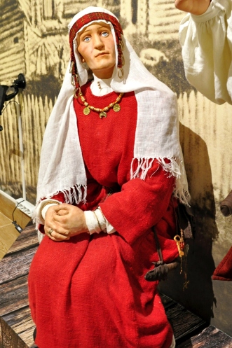 Ещё более интересны всякие амулеты, в том числе и зооморфные… как часть женских украшений. Отдельно там представлены восковые фигуры жителей тех земель, с восстановленными костюмами и аксессуарами… Жители совсем не бедные, это видно и по хорошо прокрашенным тканям, и по рисункам на тканях, и по украшениям и кожаной обуви. Ну и по меху у человека (мужчины).