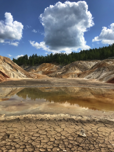 Такой окрас вода получила за счет высокого содержания в глине различных элементов: пирита, слюды, зерен кварца, марказита, рутила, ильменита. Голубое небо и облака эффектно смотрятся на фоне этих озёр.