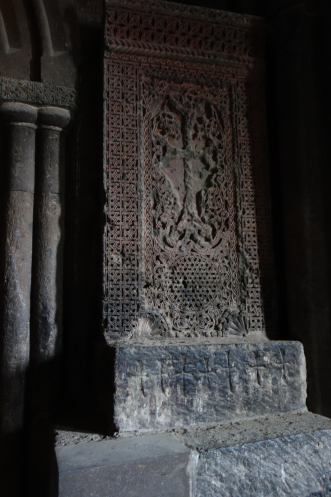 Сначала мы посетили могилу Месропа Маштоца в селе Ошакан. Церковь над могилой 19 века, а сама могила 5 века расположена под алтарем. Во дворе церкви стоят выполненные из туфа в виде хачкаров буквы армянского алфавита.