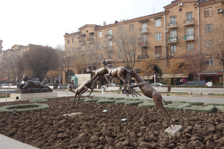 Прибыла в Ереван я в 7-40 местного времени (в Москве в это время было 6-40). Думала, что захочу спать, едва добравшись до отеля, но нет, потянуло на подвиги. Попила в номере чай, попросила на рецепции карту с достопримечательностями, где мне поставили крестик примерно в районе отеля, и пошла гулять, предварительно поменяв некоторое количество денег на армянские драмы: хоть и принимают наши карты Мир, но не везде – на Вернисаже точно только за наличку можно сувениры купить. С прошлого визита мне запомнилась зелень, обилие на улицах питьевых фонтанчиков (зимой не очень актуально, но летом было кстати), отделанные туфом дома (по сравнению с нашими панельками очень красиво) и бельевые веревки, натянутые между домами на высоте, в том числе, последних этажей. Как они их натягивали, для меня до сих пор загадка. Веревки можно передвигать по роликам, вывешивая на них белье. В этот раз я таких веревок почти не видела, хотя сотрудники принимающей стороны JUST TRAVEL, с которыми встретилась на следующий день, сказали, что они есть, и пошутили, что теперь белье тянут не руками, а с помощью пульта. Ну и еще я впервые там увидела светомузыкальный фонтан (который зимой, конечно, не работал, но вообще еще жив). Прошла мимо оперного театра, по пути разглядывая многочисленные памятники и скульптуры. Жалко, не всегда можно разобрать, кому они посвящены: надписи, в основном, армянскими буквами. Хотя памятники Сахарову и Грибоедову можно узнать и без надписей. Бюст Сахарова стоит на одноименной площади, а Грибоедову недалеко от церкви Григория Просветителя. Там же рядом памятник Зоровару Андранику, борцу за объединение западной и восточной Армении. Очень эффектный – Андраник сидит на двух конях, символизирующих обе Армении.