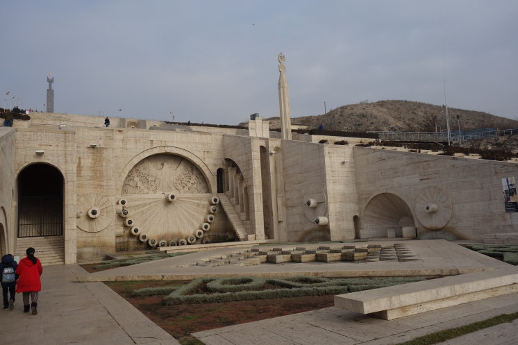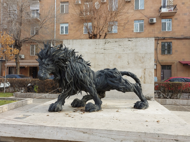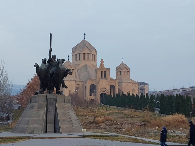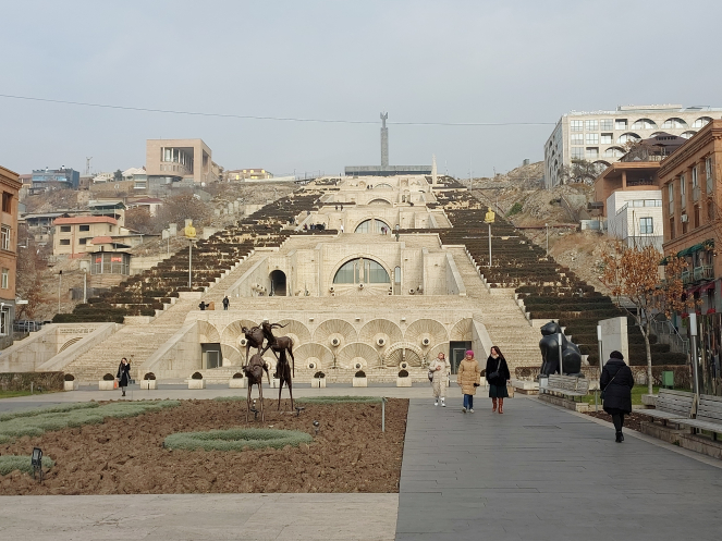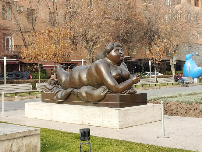 Вроде недалеко от Матенадарана возвышается статуя Матери-Армении, но дорогу к ней я не нашла. Зато вышла к середине Каскада, величественного сооружения на склоне горы с фонтанами и скульптурами, которое начали строить еще в советское время, да так и не достроили. Но недостроенную часть видно только когда подойдешь вплотную: снизу огромный котлован с торчащей арматурой не виден, каскад смотрится как одно целое со стоящей на смотровой площадке стелой. Фонтаны, естественно, не работали. Что внутри Каскада находится музей современного искусства Джерарда Гафесчана, да еще и бесплатный, я в тот момент не знала, потому спустилась вниз полюбоваться установленными прямо на улице статуями работы Фернандо Ботеро и других не менее известных авторов. «Римского воина», мне кажется, я видела в Испании, хотя пишут, что раньше он стоял в Нью-Йорке, где я не была. Потом еще долго ходила по городу, забрела на полупустой по причине буднего дня Вернисаж, дошла до памятника Вардану Мамиконяну, возглавлявшему в 5 веке борьбу армян с сасанидской Персией за свою религиозную и национальную идентичность. Забавно, но подруга, которой я отправила фото, решила, что я в Уфе и это памятник Салавату Юлаеву.