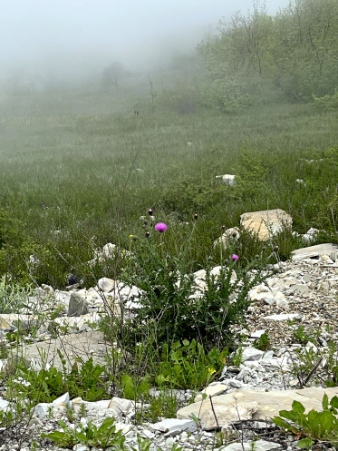 Но был и подарок – на вершине хребта помимо разных беленьких, желтеньких, сиреневеньких цветочков цвели и «лохмачи» – пионы узколистные (тонколистные) (лат. Paeonia tenuifolia), а я в наших краях на их цветение не попала по ряду причин, расстраивалась, потому что очень хотела. И тут вот, сюрприз-подарок… Конечно, когда степь покрыта кроваво-красными коврами лохмачей – это другое, но и здесь, в облачном молоке на склонах Маркотхского хребта бордовые капли диких пионов завораживали.