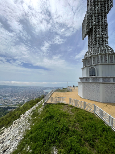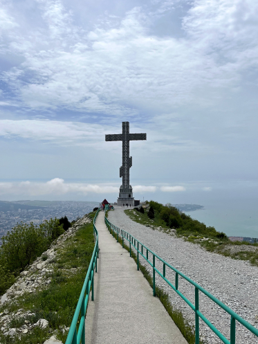 Короткая справка: Поклонные крест заложен в 2015 году, открыт в 2020 году. Внутри основания находится небольшая часовня и частица мощей преподобного Серафима Саровского. Крест выполнен из металла. Его высота составляет 34 м, высота основания – 9 м, итого высота всей конструкции 43 м, находящихся на высоте 580 м над уровнем моря. От верхней станции канатной дороги что-то около 1 км, говорят, можно подняться от набережной и пешком…