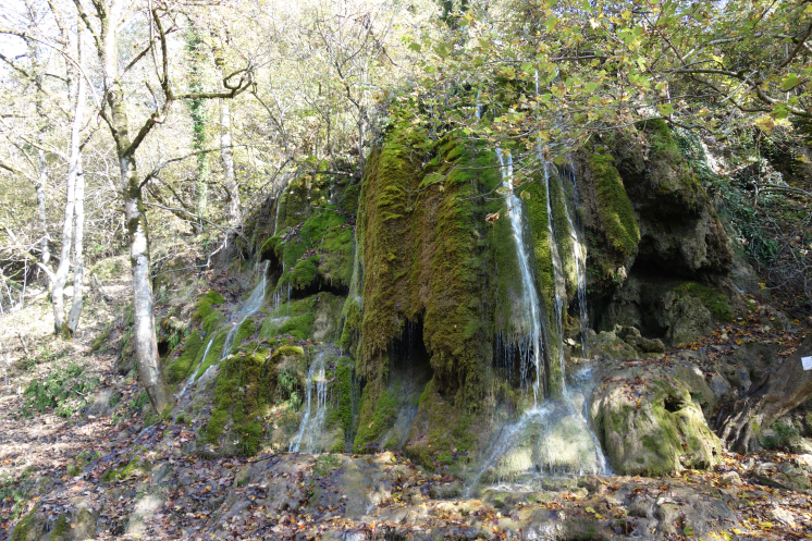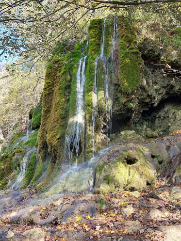 Дальше мы двинулись в деревню Лекит, где уполномоченный для общения с туристами местный житель сообщил нам, что на нашей машине к достопримечательностям доехать нельзя, но за отдельную плату он вызовет водителя с джипом. Мы от джипа отказались, тем более, до самого водопада на джипе все равно не доедешь. Идти по лесной тропинке было не особо тяжело, хотя местами грязновато. И мостик через горную речушку не для слабонервных: на опоры положено несколько щелястых раскачивающихся досок, никаких перил. На полянке у дедка оборудован лагерь: стол, скамейки, печка для чайника. Пришлось попить чай с местными печеньками, пока наш набожный водитель молился в сторонке. Я потом деду один манат дала, остальные воздержались. Через некоторое время в лагерь пришли 3 пожилых музыканта с народными инструментами. Водопад небольшой, с норвежскими, скажем, не сравнить, но симпатичный: это поросшая мхом скала, с которой струится вода. Водитель забрался на вершину, мы сфотографировались внизу.