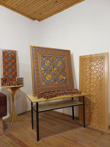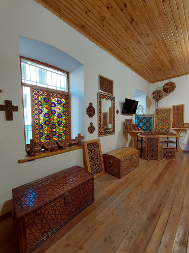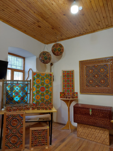 В Шеки Лара и водитель тоже ночевали в другом отеле и тоже опоздали к назначенному времени. Впрочем, касса находящегося рядом дворца шекинских ханов еще не работала. Фотографировать во дворце запрещено, а так как больше туристов практически не было, сотрудник бдительно следил, чтобы мы чего не сфоткали. Небольшой летний дворец симпатичный, конечно, и неплохо отреставрирован, но видела я восточные дворцы и покраше, в том же Иране или Марокко, где фотографировать не запрещали и даже плату за это не брали. Дальше мы зашли в мастерскую керамики и к мастеру шебеке. Шебеке – нечто среднее между витражом и пазлом: на бумаге расчерчивается рисунок, под него выпиливаются деревянные планки с пазами и разноцветные стекла, а потом это в определенном порядке собирается. Из-за точного подгона деталей итоговая конструкция получается довольно крепкой: мастер от души шарахнул по готовому изделию – ничего не высыпалось и не разбилось. Ну и дерево тщательно готовится перед вытачиванием деталей, чтобы оно потом не рассохлось и не покривилось. Нам дали попробовать пособирать. Мне было интересно, как собирают последний ряд – оказалось, внешнюю рамку чуть раздвигают, чтобы просунуть детали в пазы, а потом снова плотно прижимают.