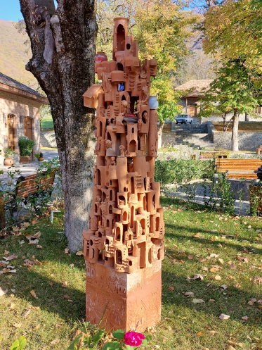 По плану мы еще должны были в тот день посетить Нидж, где живут удины, потомки одного из древних албанских племен Кавказской Албании, упомянутых Геродотом, Плинием и т.п. (не путать с современной балканской страной). Но из-за того, что мы поехали объездным путем, до темноты не успели, так что поехали в гостиницу в Габалу, где должны были ночевать. Отель Gabala Garden 5* расположен на окраине, рядом с ипподромом, из окон видны горы. Для чего такой роскошный отель в таком диком месте – непонятно. Может, в горнолыжный сезон он заполняется, а так особого наплыва гостей не заметно. Нас почему-то поселили в юниор сьюты, хотя в отеле есть номера и поскромнее. Я даже сняла номер на видео, послать друзьям: в таких роскошных двухкомнатных номерах я останавливалась всего 2-3 раза, и тоже случайно. Заметно, что до этого номером давно не пользовались: в номере дикая жара, спрятанный в тумбочке стола минихолодильник раскалился настолько, что перестал работать. Первым делом я открыла двери на оба больших балкона и выставила туда колбасу и вино из Ивановки – на улице к вечеру заметно посвежело, да и горы рядом. Потом позвонила на рецепцию и сказала, что холодильник не работает – обещали починить. Напарница, как выяснилось назавтра, звонила, чтобы настроить кондиционер на более сильное охлаждение – ей тоже обещали мастера, который тоже не появился. Кондиционер работал, но быстро разогнать жару не мог. Собираясь в поездку, я прочитала описание отелей, потому на всякий случай взяла с собой купальник. Бассейн работал до 9 вечера, так что я вполне еще успевала поплавать. Работники СПА-комплекса предлагали еще и массаж сделать, но это было бы слишком (и наверняка за дополнительную плату). А вот поплавала я в свое удовольствие, около часа одна в большом бассейне. Раз появился сотрудник замерить температуру воды да через какое-то время пришел мужчина и расположился на лежаке, колупаясь в телефоне: в воду он при мне не полез. За это время в номере посвежело почти до нормальной температуры, а холодильник при открытой дверце тумбочки приостыл и заработал, так что я переставила в него продукты с балкона. Надо сказать, в магазине на голодный желудок колбаска показалась мне гораздо вкуснее, чем в номере. А вино ничего, пошло. Ну и купленный на дороге гранатовый сок был выше всяких похвал. Единственно, что слегка омрачило проживание в этом замечательном номере – я так и не смогла добиться горячей воды из крана, поэтому пришлось мыться холодной. Но утром горячая вода появилась, так что голову я смогла помыть нормально. Завтрак тоже был гораздо лучше бакинского, хотя и там он был вполне нормальный.