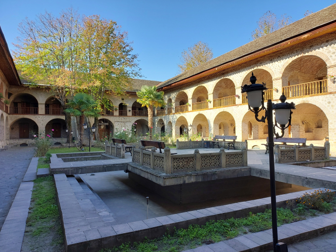 Отель Sheki Palace 4* тоже переделан из старинного здания, номер в нем был гораздо скромнее, чем в Габале. Бассейн тоже был, но поменьше и попасть в него можно только пройдя по улице и спустившись на лифте. Удовольствия от плавания я получила гораздо меньше: народ купался с детьми да еще в какой-то момент в углу зала обвалился большой кусок потолка. Хорошо, в том месте никого не было. Вроде над чашей бассейна мокрых пятен на потолке не было, но осадок остался: я периодически с опаской поглядывала на потолок.