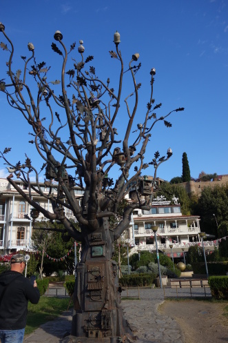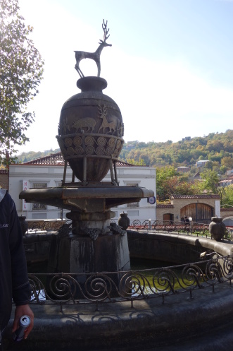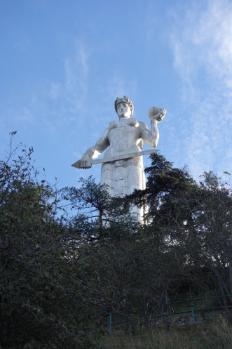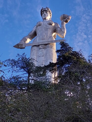 А вот в монастыре Самтавро, где похоронены первые христианские грузинские цари, я в прошлый раз не была, только в Джвари и Светицховели. Обедали в Мцхете, по рекомендации гида мы с будущей напарницей (вот как-то сразу нашли друг друга) взяли одно блюдо на двоих, безумно вкусное и дорогое: тушеное в красном вине мясо, окруженное кусками пирога с фаршем. Как оно называется, не знаю: пыталась записать со слуха, чтобы потом найти в интернете, но не получилось. К мясу мы взяли кувшинчик домашнего вина, очень приличного. Вино мы поделили уже на троих, с женщиной, с которой моя напарница накануне ехала из Владикавказа (у той был более короткий тур). В обзорной по Тбилиси ничего нового для себя я не открыла, увидела даже меньше, чем в прошлый раз: крепость Нарикала на реконструкции, к водопаду в Инжирном ущелье не пройти – ремонт после обвала. Но это компенсировалось вдохновенным гимном Тбилиси, который гид Ираклий выдал нам у подножия статуи Грузии-матери.