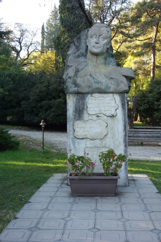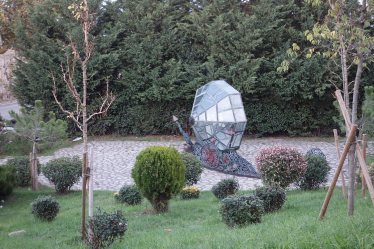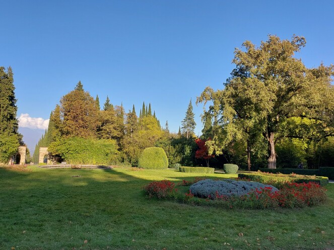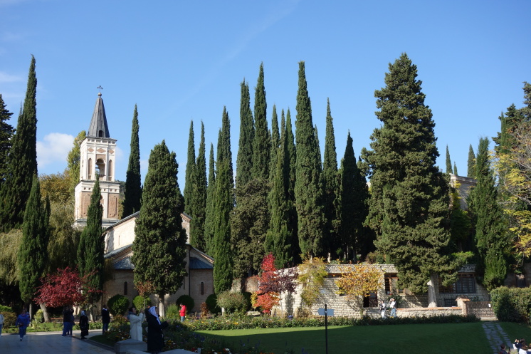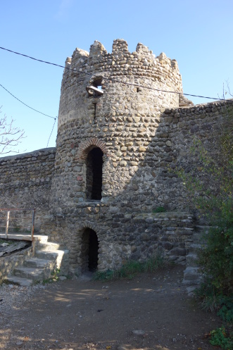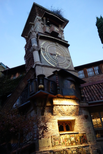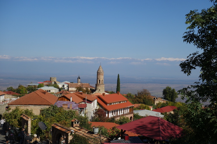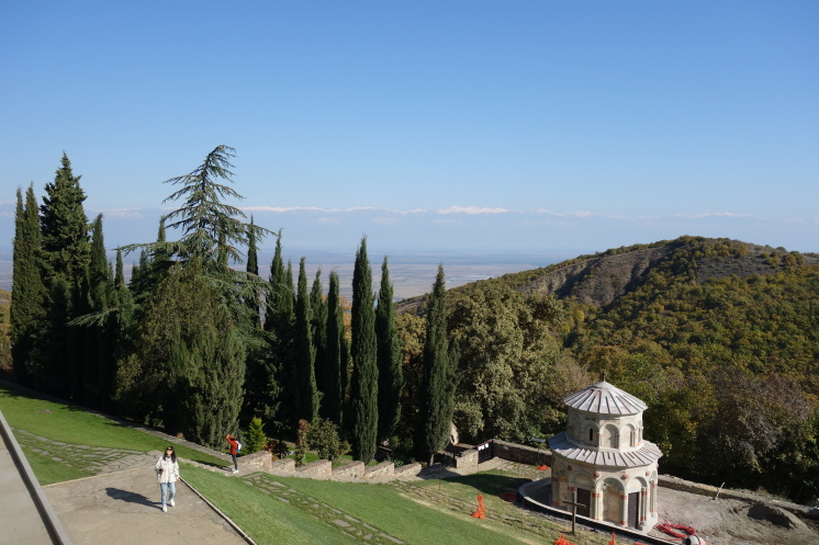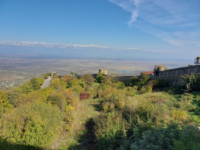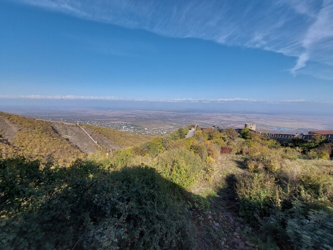 Следующий день тоже почти весь был по знакомому маршруту: монастырь св.Георгия Бодбе и Сигнахи, только на этот раз мы возвращались в Тбилиси другой дорогой, посетив Цинандали и Телави. Собственно, в Телави мы попали на закате дня и видели только 900-летний платан, запечатленный в «Мимино», да статую царя Ираклия II и его крепость из окна микроавтобуса. В Цинандали посетили музей Чавчавадзе, продегустировали вино и спустились в подвал, в котором все еще хранятся старинные запыленные бутылки вина. Над подвалом сейчас расположен отель, но в полу холла есть стеклянная вставка, а посетители музея по тем же билетам могут спуститься вниз с сопровождающим. Алазанская долина была так же красива, как и раньше, даже лучше: еще листва не вся опала. И в этот раз я спокойнее прошла по крепостной стене: в прошлый раз меня накрыл приступ высотобоязни. А историко-религиозными рассказами в Бодбе Ираклий не особо заморачивался. Вернулись в Тбилиси мы довольно поздно, по пути на каком-то перевале сфотографировав красивый закат. Обедали в Сигнахи, тоже довольно дорого (я взяла харчо за 25 лари), но уже не так вкусно. Харчо у меня было вполне себе, если не считать, что ему красная цена 10 лари, а вот напарница взяла по совету официантки какое-то местное блюдо и получила кучку голых костей за бешеные деньги. Перед обедом в подвале ресторанчика мы продегустировали несколько вин их производства, для себя я отметила киси на будущее, но покупать там что-либо не стала: неоправданно дорого, да и таскаться с бутылками неделю до отъезда домой не хотелось.