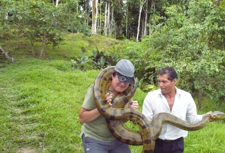 Едем на экскурсию к местным жителям, где нам дают подержать в руках и посниматься с настоящей анакондой, метра 4,5 длиной.