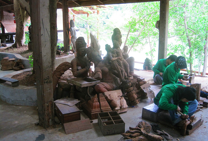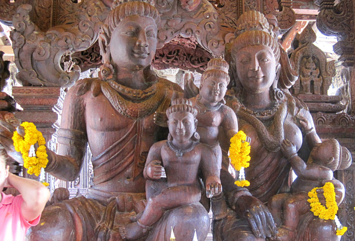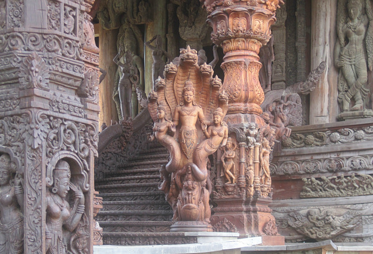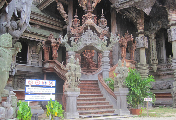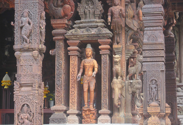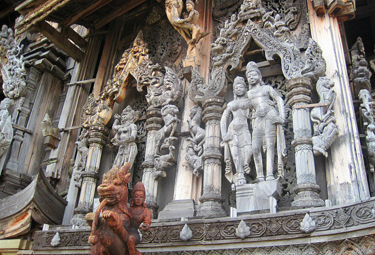 Храм поистине уникальный, строится только из ценных пород дерева, таких как золотой тис и красное дерево, и отличается от традиционных буддийских храмов. Все сооружение, высотой 105 метров, изукрашено тончайшей резьбой и рельефными скульптурными изображениями религиозных и мифических персонажей стран Таиланда, Индии, Китая и Камбоджи.