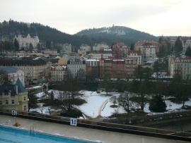 Во время весенней поездки в Карловы Вары мы запланировали и посещение бассейна отеля "Термал". В тот день, когда мы приехали в город, с утра были чуть ли не заморозки), к полудню прогрелось, но всё равно на улице было чуть выше +10). Но, раз запланировали, привезли купальники и полотенца, то решили выполнить и этот пункт плана. На входе в бассейн, который находится на горке над самим отелем, купили билеты на посещение и прошли внутрь. Внутри всё понятно - куда идти, что делать), вещи складываются в кабинку, ключ, как в аквапарке, надевается на руку. После купания есть возможность высушить голову, привести себя в поядок, отдохнуть. Ну, а купание было просто отличным, вода была около +30 градусов, главное в такую погоду - не мочить голову, а так плавать совсем не холодно. Самое замечательное в этом бассейне - это шикарные виды на Карловы Вары! Бассейн отеля "Термал" добавил новые краски во время посещения Карловых Вар и очень разнообразил экскурсионный отдых).