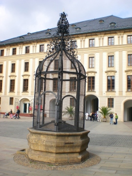 Безымянный колодец, начиная с XVII века, выполнял свою прямую роль – поставлять воду для питья или тушения пожаров, а когда Прагу в 1757 году осаждали пруссы, он был единственным источником питьевой воды во всем Пражском Граде. Функционировал 17-метровый колодец вплоть до 1905 года, неизменно насыщая горожан необходимой влагой. Потом его накрыли кованой решеткой. В эпоху Ренессанса колодцы часто украшали художественной ковкой, так случилось и с вышеупомянутым. В XVIII веке колодец во II дворе облагородили характерной для архитектурного стиля декоративной решеткой, напоминающей со стороны купол или клетку. Таким образом, колодец с 8-гранным основанием «вырос» в 5-метровое сооружение.