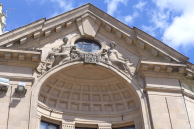 По обеим сторонам большого слухового окна размещены скульптуры античных богов в виде горельефа, которые словно ненадолго присели на мощный карниз. Меркурий — бог торговли. И Афина, покровительствующая развивающейся промышленности, держащая в руках инструменты. Рядом с античными богами - дети, которые, в свою очередь, держат дары полей — вся композиция основана на гербе Риги, который помещён на глобус. Скульптуры выполнены Августом Пфольцем, самым знаменитым скульптором Латвии довоенного периода. С балкона, который выходит на Домскую площадь, выступали политические лидеры Латвии разных эпох.
