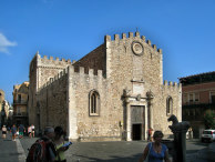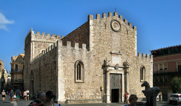 Кафедральный собор Таормины (Duomo di Taormina), похожий на крепость, был построен в XV веке на руинах небольшой средневековой церкви. Собор, посвященный святому Николаю Чудотворцу, имеет традиционный латинский крест в плане – центральный неф и два боковых придела, в которых установлены шесть малых алтарей. Неф поддерживают шесть монолитных колонн, по три с каждой стороны, сделанных из розового таорминского мрамора. Капители колонн украшены орнаментом в виде перьев и чешуи. Деревянные балки на потолке нефа поддерживаются резным карнизом с изображением арабских сюжетов, но выполненных в готическом стиле. Весьма примечательный главный портал собора был перестроен в 1636 году и выделяется огромным круглым окном-розеткой в стиле ренессанс.
