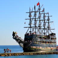 Этот великолепный корабль был спущен на море в апреле 2017 года и сегодня является самым большим и роскошным кораблем в Турции. К услугам гостей работают: 2 ресторана и большой бар. Насладиться покоем и идеальным отдыхом можно на первой нижней палубе, где к услугам гостей есть телевидение, кондиционеры и тишина. Для взрослых и детей есть анимация! Проводят интерактивные игры, конкурсы с подарками и призами. Так же вас ждёт настоящее пиратское шоу, где наш спортсмен исполнит свой легендарный трюк, прыжок без страховки с самого верха скалы. В программе ещё вас ждёт пенная дискотека, с морем танцев и лучшими миксами от DJ. Можно позагорать на 4-ой палубе.
