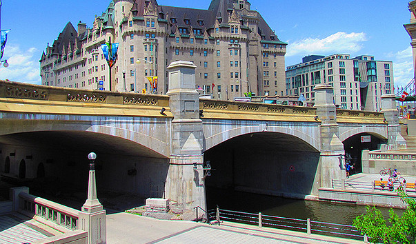 Мост Плаза находится в месте пересечения канала Ридо и реки Оттава, соединяя Веллингтон-стрит с Ридо-стрит. Он состоит из трех высоких пролетов и обеспечивает автомобильное и пешеходное движение. На восточной стороне моста находится красивое здание гранд-отеля Шато-Лорье, а на западном — Парламентский холм. До 1930 года здесь находились два отдельных моста для разного движения, но они были объединены и стали продолжением улицы Квин-стрит.