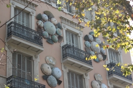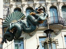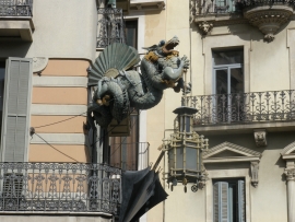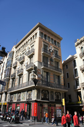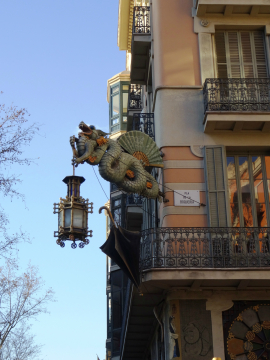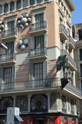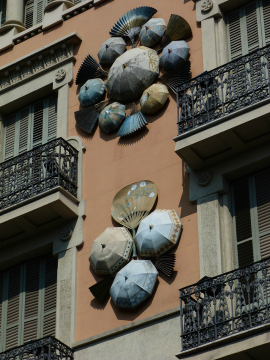 Интересный объект. Дом Бруно Куадрос красивое жизнерадостное здание. Фасад здания украшен зонтиками, веерами и драконами. Оно всегда находится в зоне внимания гостей Барселоны.