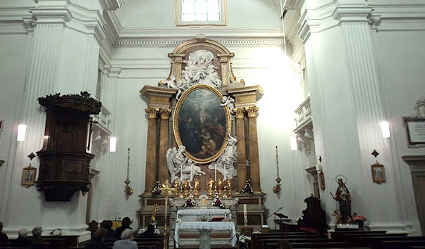 Большое здание церкви доминирует на главной площади города. Вход в храм венчает треугольный фронтон с гербом Папы Александра VII, а само здание увенчано куполом. Войдя внутрь, посетители смогут насладиться непревзойденной работой лучших мастеров, которыми управлял Антонио Рагги. Среди всевозможных барочных декоративных элементов, скульптур и картин особое внимание привлекает разноцветный мраморный алтарь с колоннами, на котором размещена жемчужина церкви – изображение авторства Пьетро да Кортона «Распятие».