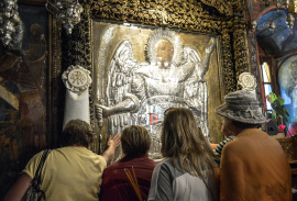 Это та самая Чудотворная икона Михаила Архангела,ради поклонения которой сюда и приезжает столько народа.