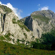 Тропа траверсирует склоны Большого Тхача. Наша цель - вершина Большого Тхача (2368м). На нее мы поднимемся налегке, без рюкзаков. С вершины открывается великолепный вид на Чертовы ворота, Малый Тхач, плато Лаго-Наки, вершины Главного Кавказского хребта.